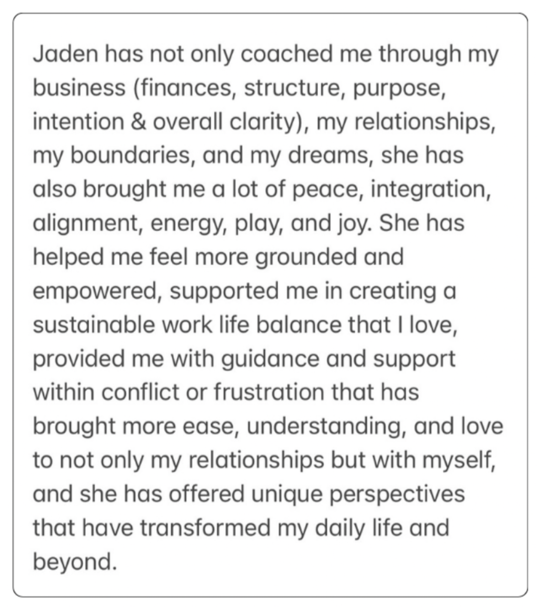 Work with Jaden to support your energy, focus, and capacity as a leader. Coaching blends both your inner world and practical business mentorship. Each container is focused on creating extraordinary results.