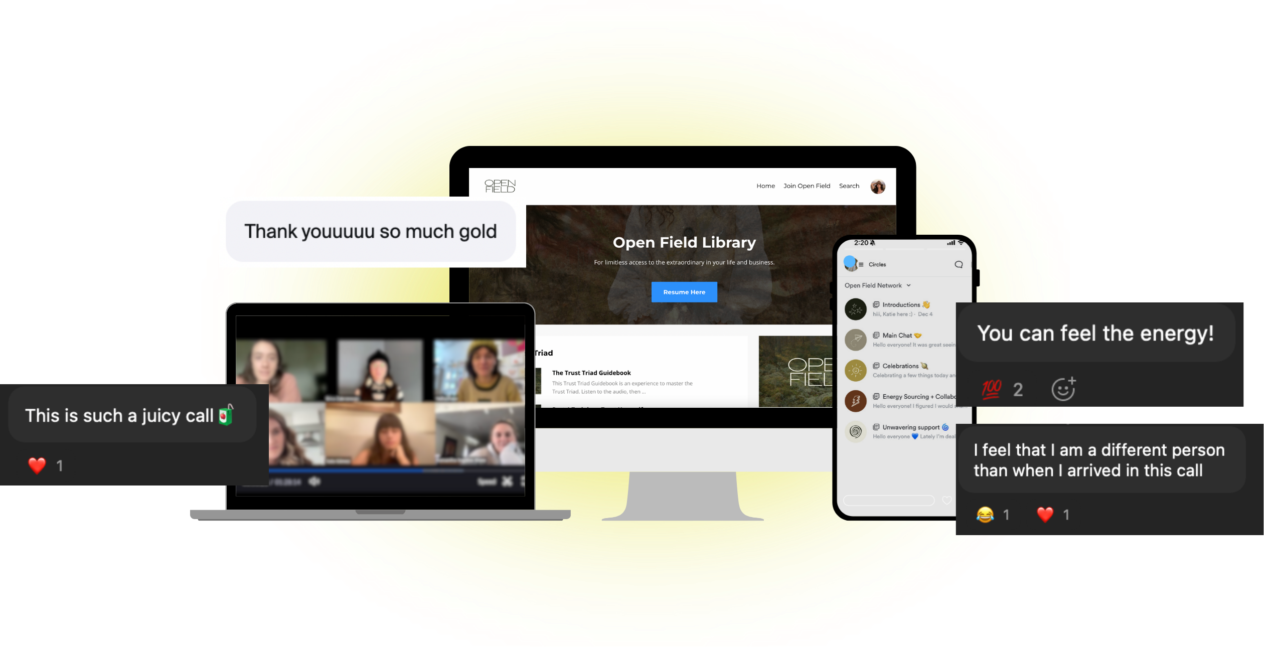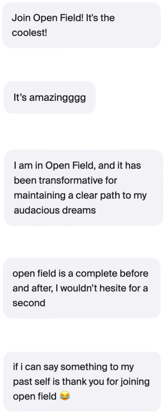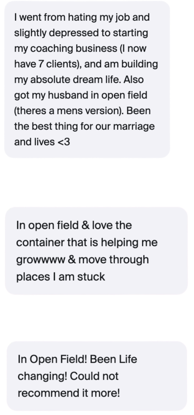 Open Field is what it is because of the people who are inside. When you join, you will be surrounded by women who think big, speak their truth, and hold a high vision the same way you do. Our group calls are full of energy, the chat is always on fire, and it’s very common for our members to collaborate and form lifelong relationships.